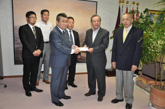 吉住区長(右から2人目)に目録を手渡す橋本組合長