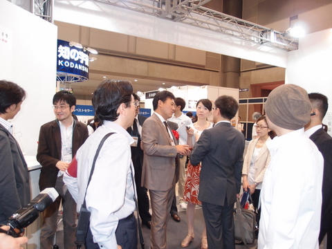 ブースで自ら説明に立つ三木谷社長(中央左)