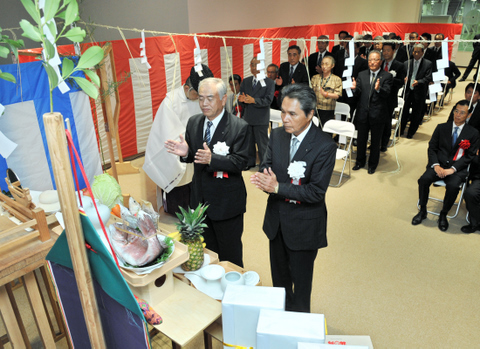 神事で無事完成を祝う高知新聞・宮田社長(右)