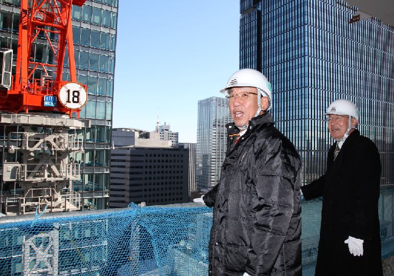 読売巨人軍前監督の堀内恒夫さんが1月28日、東京・大手町の読売新聞東京本社新社屋建設現場の「1日建設所長」を務め、厳寒の中で工事を続ける作業スタッフらを激励した。