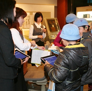 耳の不自由な子どもたちが手元のiPadをのぞきこんでいる。「昔、原稿を運んでいた動物は?」。見学ガイドが説明すると、その内容が1、2秒後には画面に表示される。子どもたちは筆談ボードに「ツバメ!」と書…