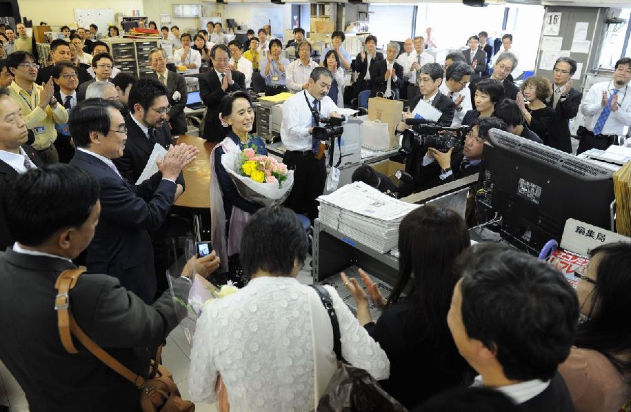 スーチー氏が毎日新聞社を訪問 編集編成局でメッセージ