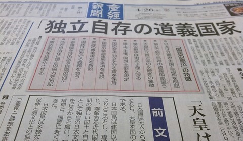 産経新聞社は4月26日、「『国民の憲法』要綱」を発表した。創刊80周年と、雑誌『正論』40周年の記念事業として進めてきたもので、同日付朝刊1面トップに、その特徴と前文を掲載。中面6ページにわたって全…