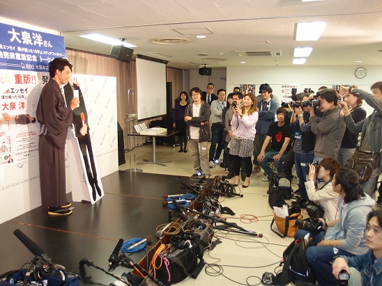 トークショー後の囲み取材で報道陣に向けポーズをとる大泉氏