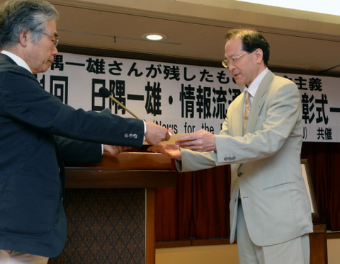 表彰式で特別賞を受賞する東京新聞特報部の野呂法夫デスク=都内で