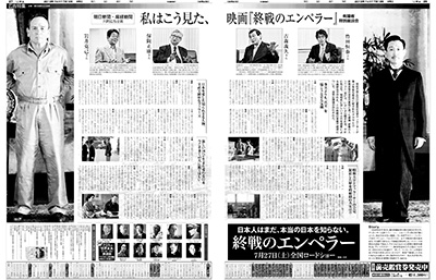 朝日新聞社は7月19日付東京本社版朝刊全30段で、松竹配給の映画「終戦のエンペラー」の広告特集を掲載した。産経新聞社との共同広告企画で、映画のテーマでもある、昭和天皇とマッカーサー元帥との2ショット…