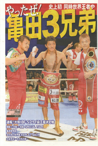 サンケイスポーツは9月5日、プロボクシングの亀田3兄弟が同時に世界王者になったことを記念して、タブロイド判24?の特別版「やったぜ!亀田3兄弟」(オールカラー、定価300円)を発行した。 1…