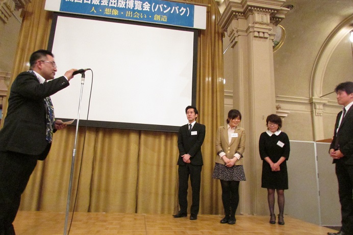 得トークバトルで選ばれた出版社(右)、左は洞本氏