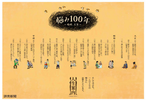 時代や世相を反映した悩みの見出しが紹介されている「悩み100年 嗚呼、人生」編