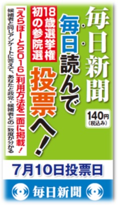 毎日新聞社は7月4日から9日まで、東京都内などのコンビニエンスストアーや駅売店にPOP広告=写真=を張り出す。掲示する売店数は約1000店で、毎日新聞が提供しているボートマッチ「えらぼーと2016年…