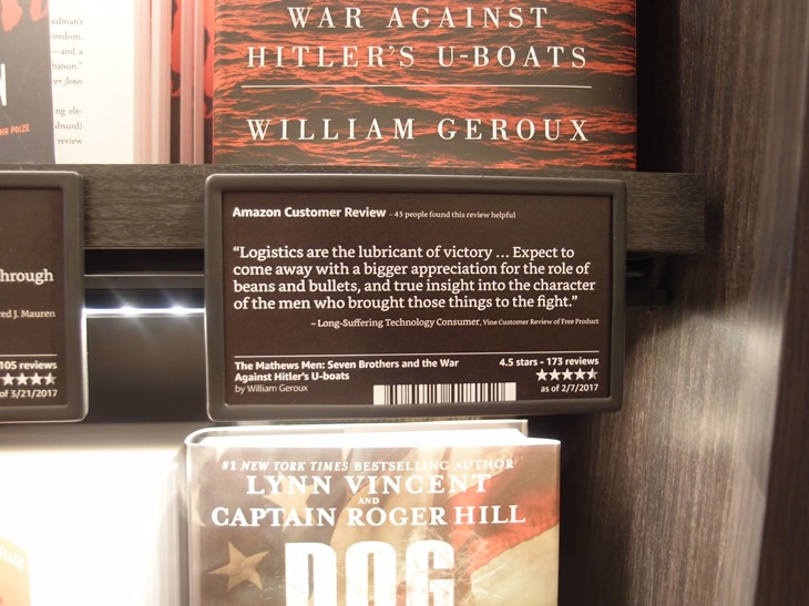 書籍は全て面陳されており、それぞれにネット上で寄せられたカスタマーレビューとバーコードを表示。