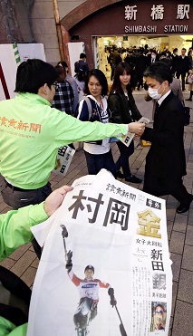 新橋駅前で配布された読売新聞の号外(14日)