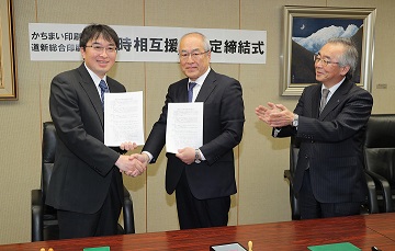 調印を終え握手する(左から)林社長、吉田社長、広瀬社長