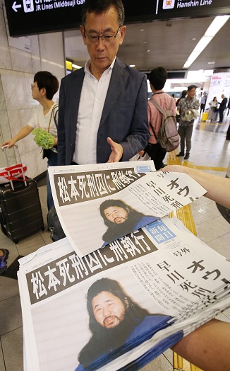 読売新聞社は7月6日、松本、地下鉄両サリン事件など一連のオウム真理教事件で、殺人罪などに問われ死刑が確定した教祖の麻原彰晃こと松本智津夫死刑囚ら教団元幹部の刑執行を伝える号外を、1万7870部を発行…
