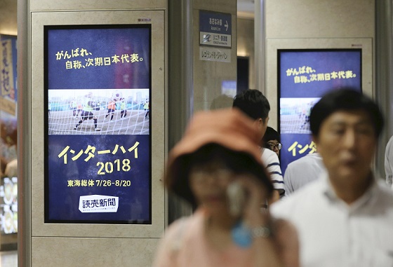 読売新聞社は7月23日〜8月5日、JR名古屋駅で、100面のデジタルサイネージ(電子看板)を使って、共催する全国高校総体(インターハイ)のCMを放映した。 今年のインターハイは愛知、岐阜、三…