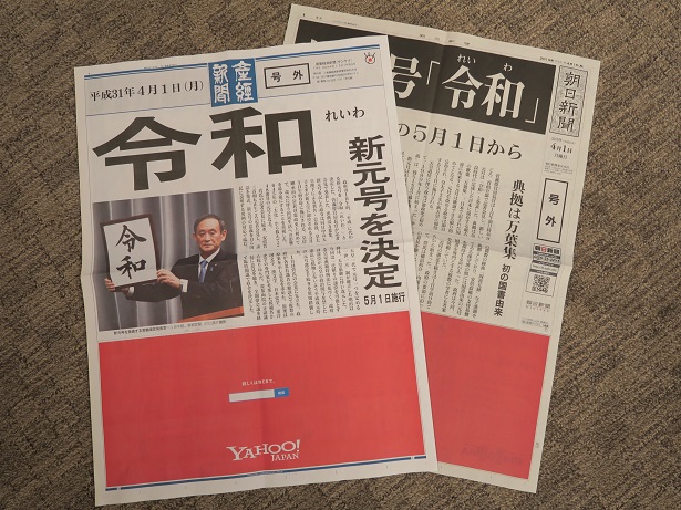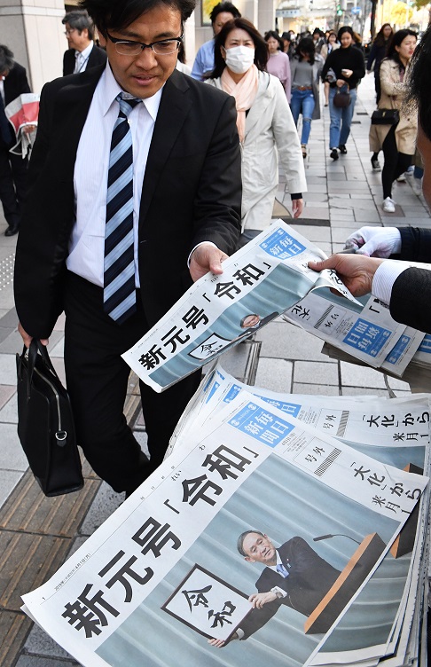 毎日新聞社は4月1日、新元号の発表を受け、JR東京駅や大阪駅前など各地で「令和」と大きく見出しに掲げた号外を配った。全国で約4万6000部を発行。東京都港区のJR新橋駅前の広場では、号外を手に入れよ…