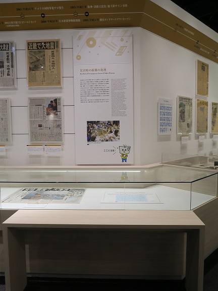 災害時の新聞の役割を紹介するコーナーに設けられている筆記台